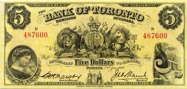 THE BANK OF TORONTO. $5.00. Jan. 2, 1937. CH-715-24-06. Marsh, left. No. 487600/D. PMG graded Gem Unc-65.