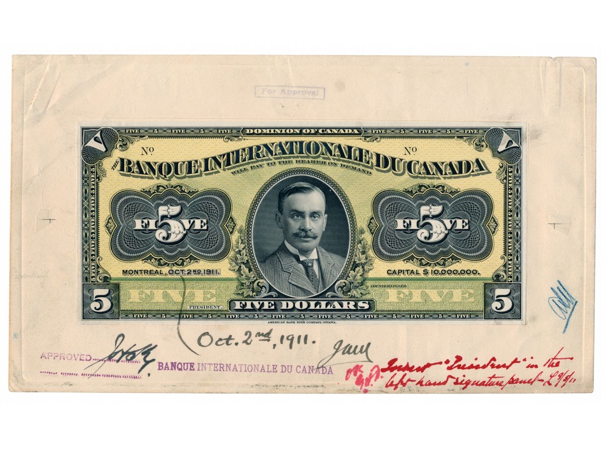 THE BANQUE INTERNATIONALE du CANADA. $5.00. Oct. 11, 1911. CH-385-10-02P. Full colour Face and Back Proofs, on large (5 1/2" x 9") approval cards. Each has several approval initials from bank officials and short notations. Unc.