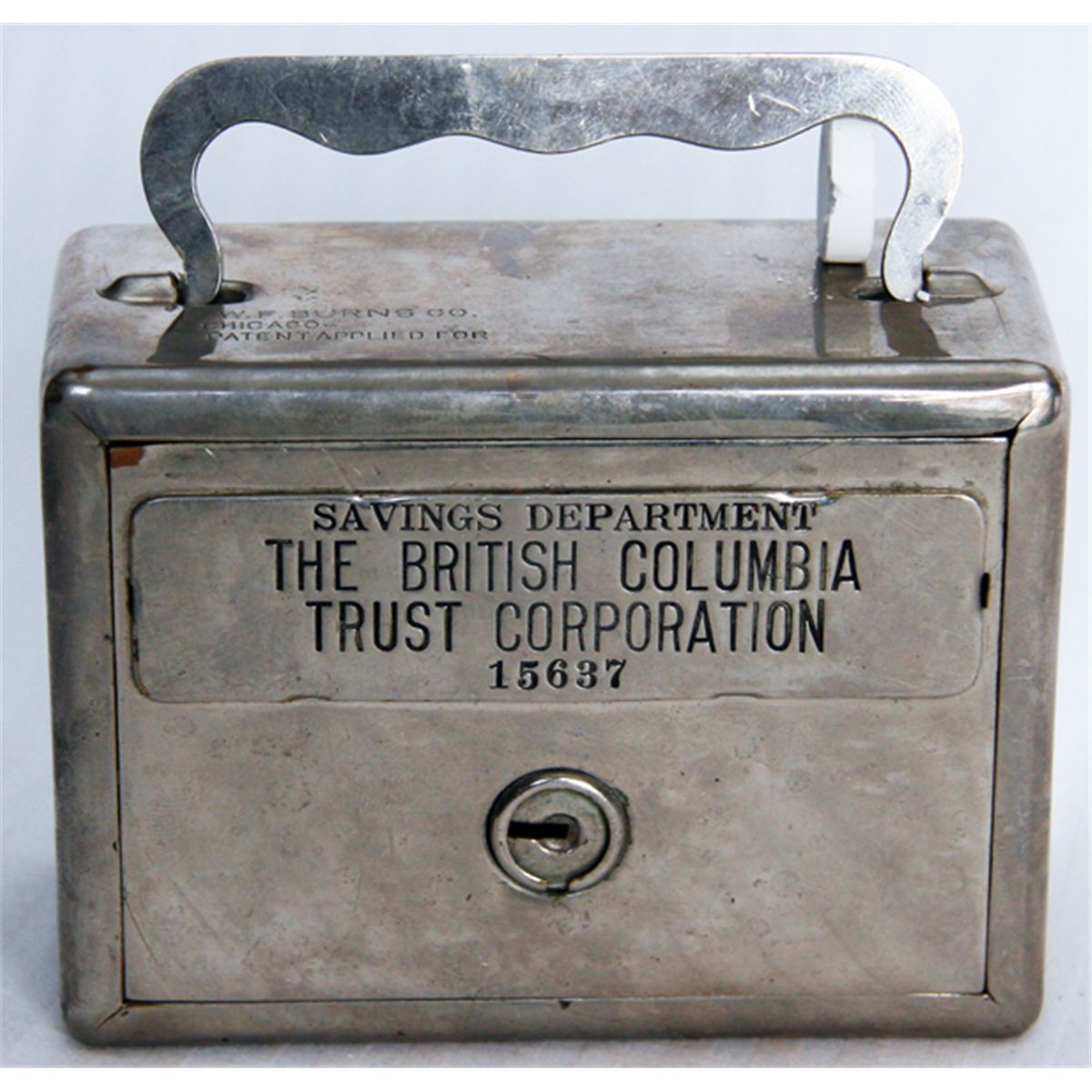 THE BRITISH COLUMBIA TRUST CORPORATION. Savings Department. A square satchel bank. Coin slot and banknote hole on right. Handle at top. Key lock, with key present. Serial number 15637. 10cm x 7cm x 4cm. Nickel plated. Maker-W.F. Burns Co., Chicago-New York. Pat. applied for. VF.