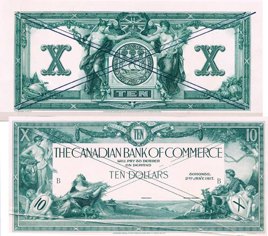 THE CANADIAN BANK OF COMMERCE. $10.00. Jan. 2, 1917. CH-75-16-02-06P. Black and White Face and Back Proofs. The proofs have been made from cancelled dies. Both have folds and other defects.