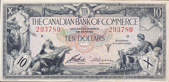 THE CANADIAN BANK OF COMMERCE. $10.00. Jan. 2, 1935. CH-75-18-06. No. 293780/D. Logan, right. PMG gr