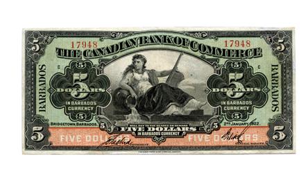 THE CANADIAN BANK OF COMMERCE. Barbados Issue. $5.00. Jan. 2, 1922. CH-75-20-04. No. 17948/C. PMG graded Very Fine-35 Net. A professionally repaired note. Bright, attractive and rare.