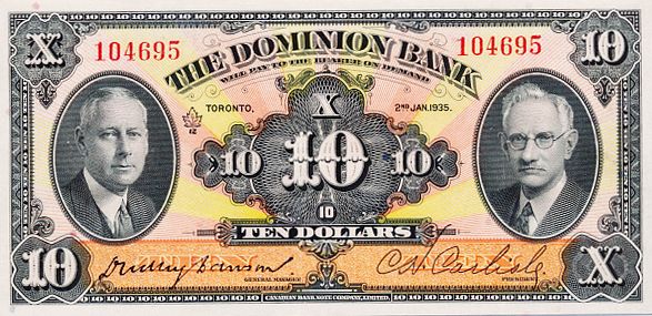 THE DOMINION BANK. $10.00. Jan. 2, 1935. CH-220-26-04. No. 104695. Signed Dawson-Carlisle. BCS graded Very Fine-30.