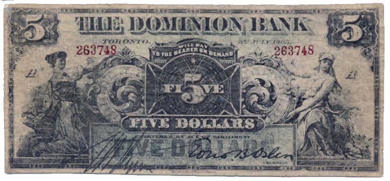 THE DOMINION BANK. $5.00. July 3, 1905. CH-220-16-06C. No. 263748/A. A contemporary counterfeit. Unlisted in Charlton, at present. Fine.