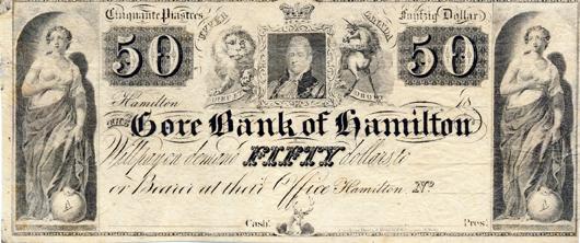 THE GORE BANK OF HAMILTON. $50.00. Funfzig Dollar. Cinquante Piastres. Ca. 1837. CH-325-10-06R. A Remainder. Stamp hinge remnants on back. A strong Fine note.