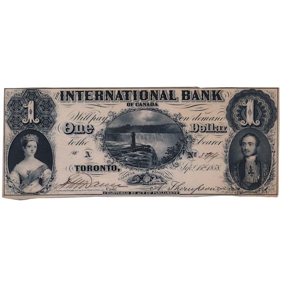 THE INTERNATIONAL BANK OF CANADA. $1.00. Sept. 15, 1858. CH-380-10-02-02. Falls. Signed Dunn/Thompson. No Protector. Serial number 594/A. A choice AU.