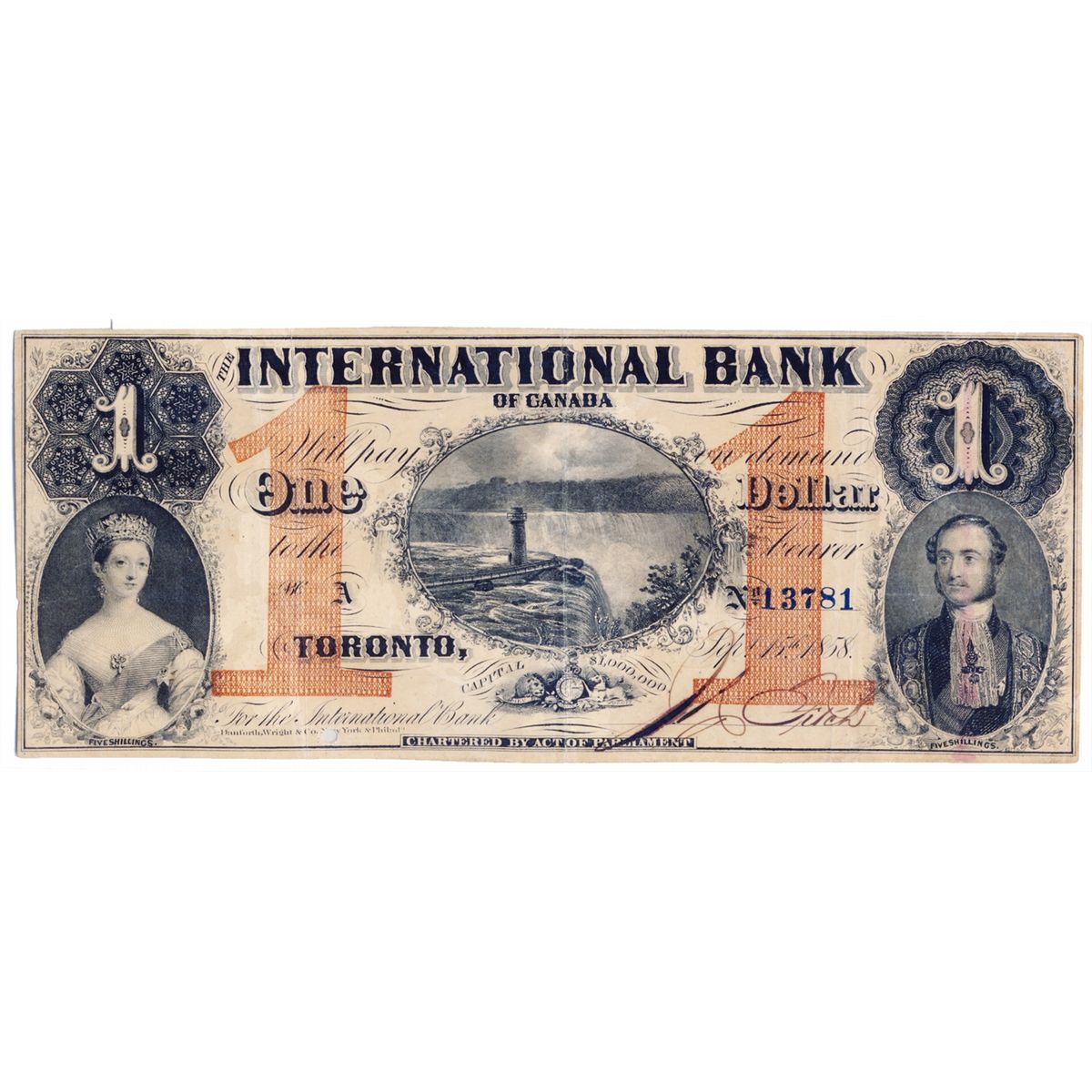 THE INTERNATIONAL BANK OF CANADA. $1.00. Sept. 15, 1858. Falls. CH-380-10-10-04. Signed J.R. Fitch. Red ‘numeral’ Protector. Small Blue Serial number 13781/A. Small circle punch at lower left margin. Very Fine.
