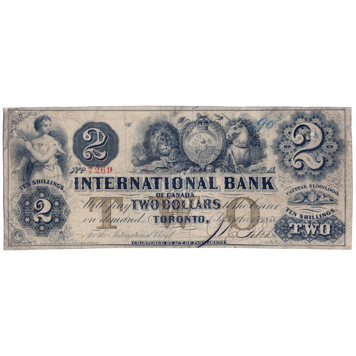 THE INTERNATIONAL BANK OF CANADA. $2.00. Sept. 15, 1858. CH-380-10-08-12. Signed J.R. Fitch. Brown ‘word’ Protector. Small Red Serial number 7269/A. Fine.