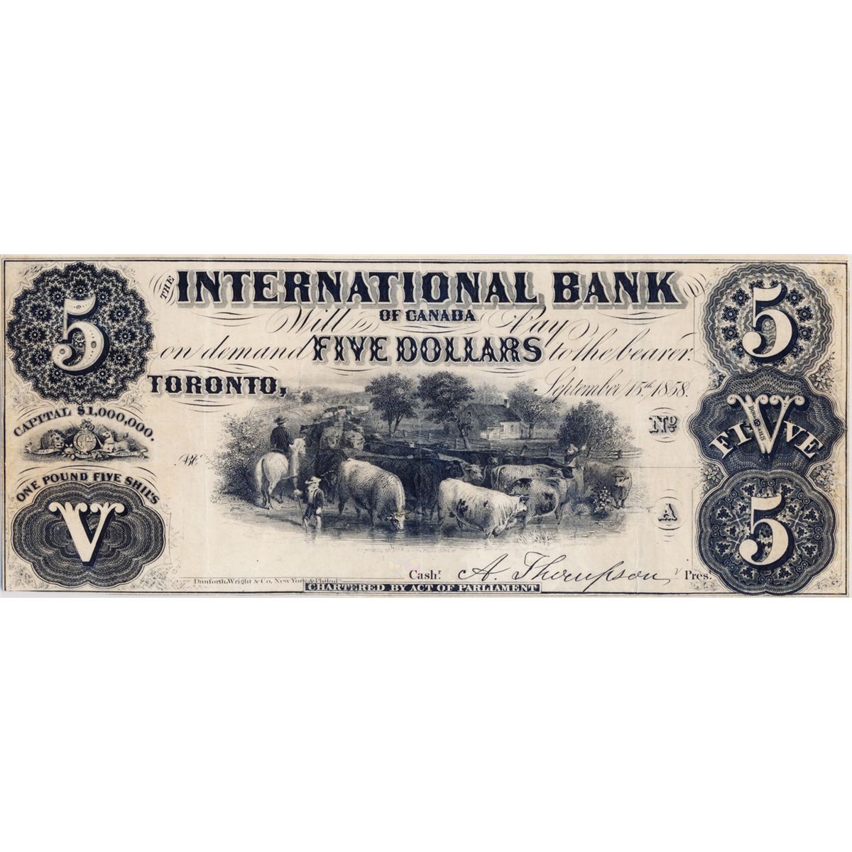 THE INTERNATIONAL BANK OF CANADA. $5.00. Sept. 15, 1858. CH-380-10--2-8R. Signed Thompson. No Protector. No Serial number. Very Fine.