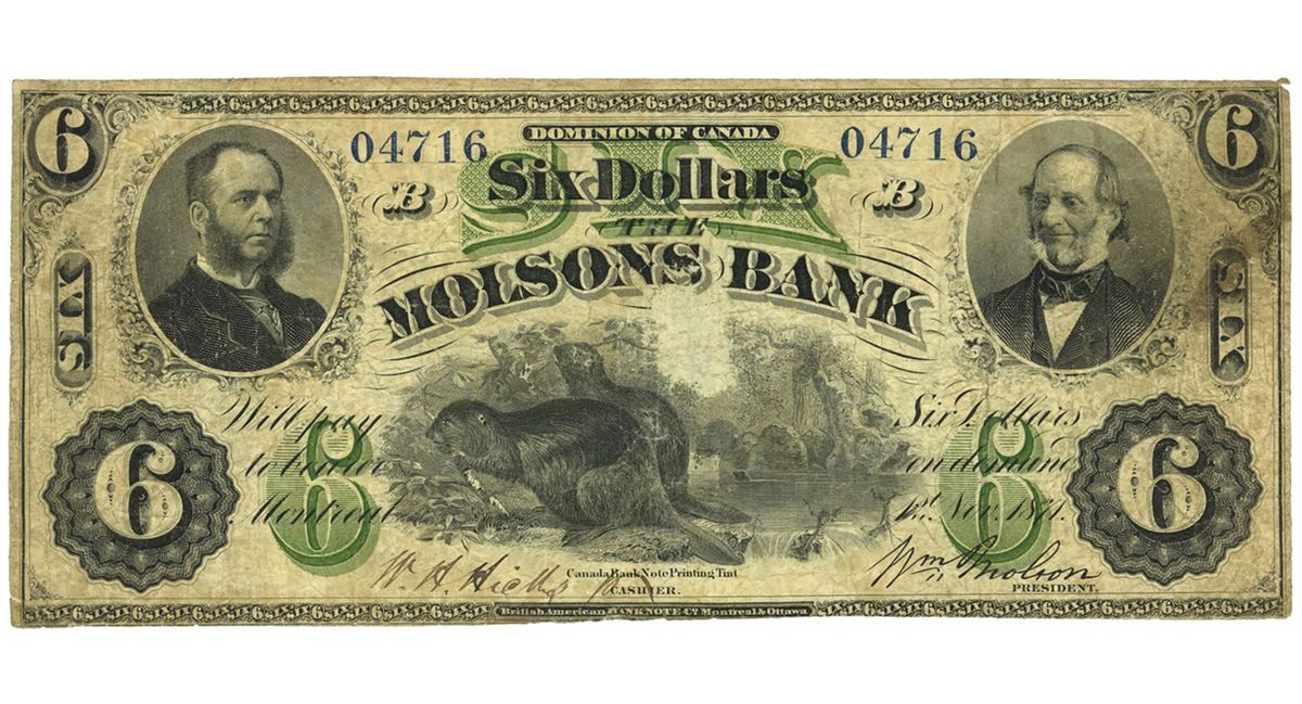 $6.00. Nov. 1, 1871. CH-490-20-02. No 04716/B. Signed W.H. Hicks/W.M. Molson. One of five known examples, with two in institutional collections. Ex. Kagin's 1986 A.N.A. auction. Very Good.