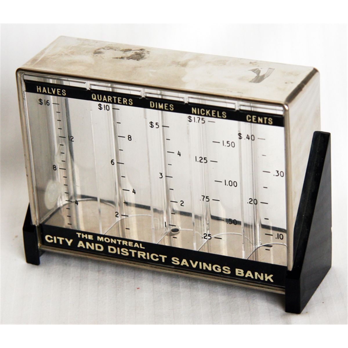 THE MONTREAL CITY AND DISTRICT SAVINGS BANK. A rectangular clear plastic bank with black highlights. Key present. Five coin slots along the front at top. Currency slot on back. 13cm x 10cm x 3 1/2cm. EF. .