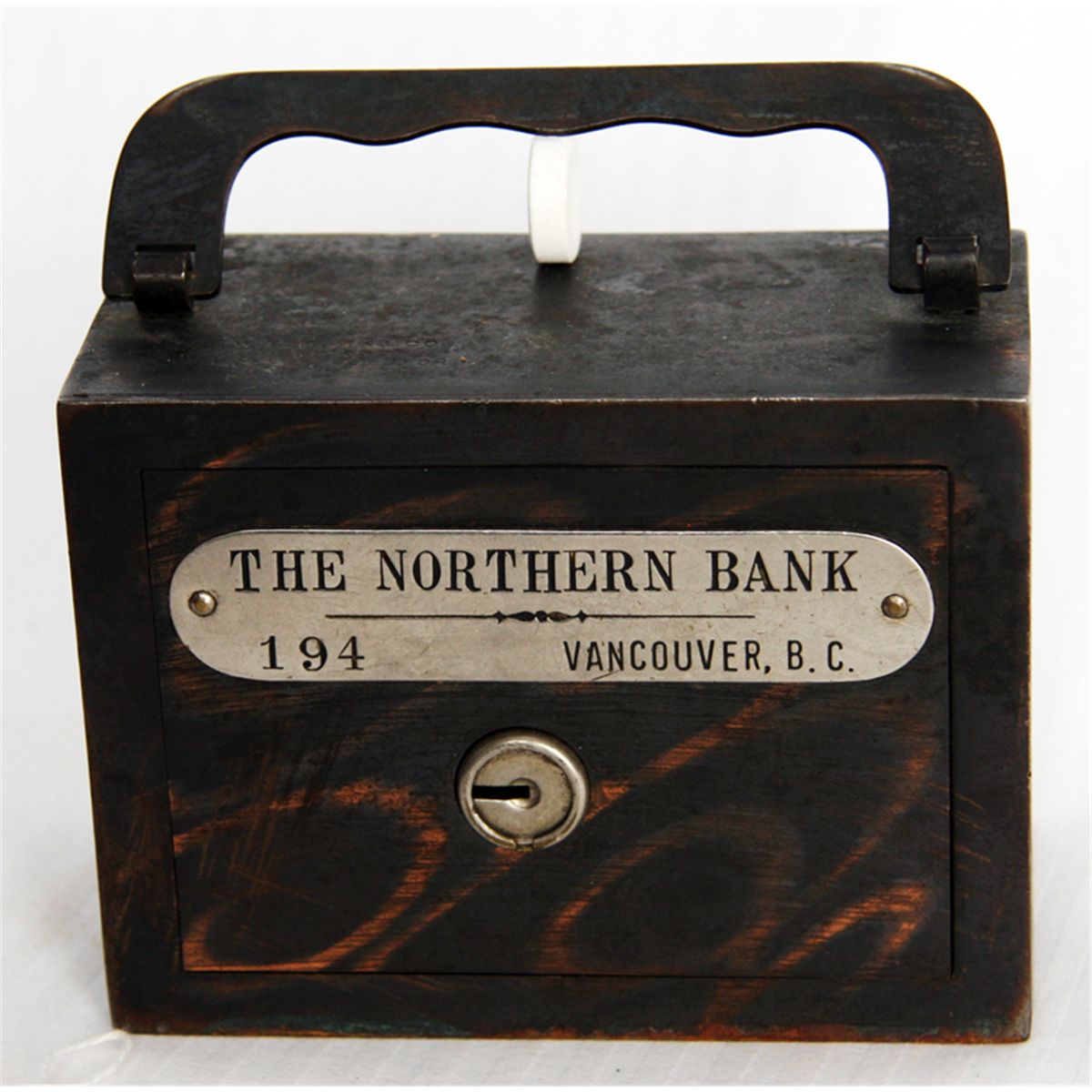 THE NORTHERN BANK, VANCOUVER, B.C. A steel satchel bank, with square corners. Coin slot at right, wi