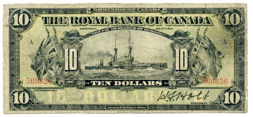 THE ROYAL BANK OF CANADA. $10.00. Jan. 2, 1913. CH-630-12-06. No. 569626/A. Manuscript signature. PMG graded Very Good-8.
