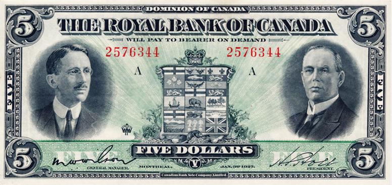THE ROYAL BANK OF CANADA. $5.00. Jan. 3, 1927. CH-630-14-04. No. 2576344. PCGS graded AU-58. PPQ. A choice example.