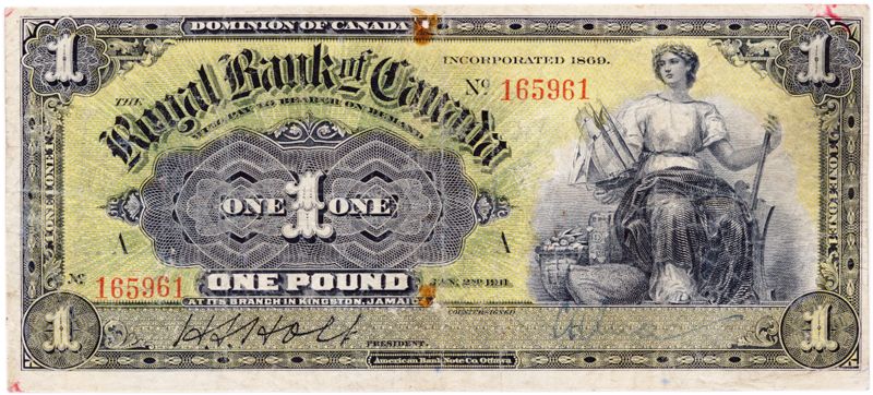 THE ROYAL BANK OF CANADA, Kingston, Jamaica. One Pound. Jan. 2, 1911. CH-630-52-02. No. 165961/A. A small pin hole at top center, and a very minor rust stain. An overall VG note.