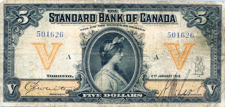 THE STANDARD BANK OF CANADA.  $5.00.  Jan. 2, 1919.  CH-695-18-12.  No. 501626/A.  PMG graded Fine-1