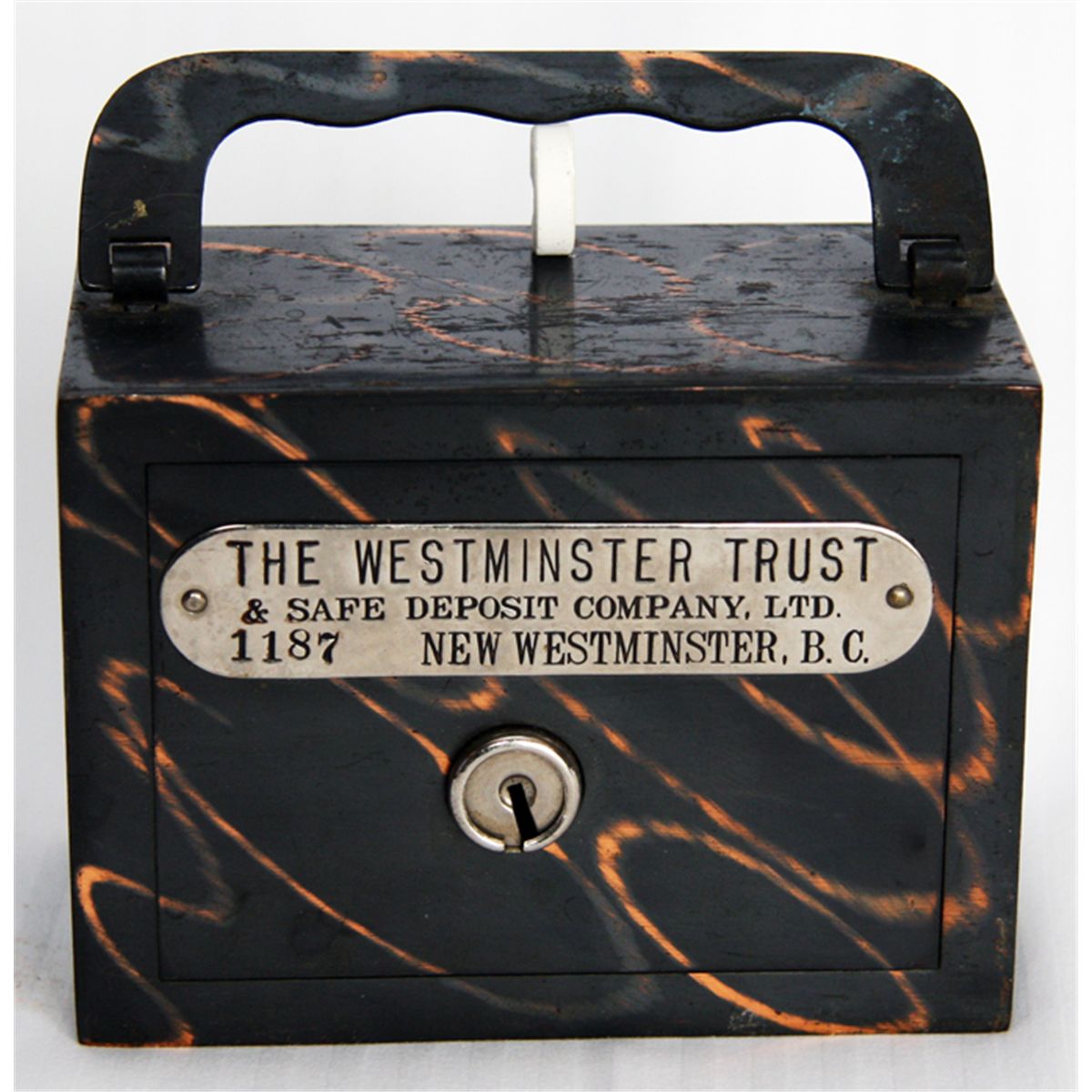 THE WESTMINSTER TRUST & SAFE DEPOSIT COMPANY, LTD. NEW WESTMINSTER, BC. A steel satchel bank, with square edges. Coin slot right. Banknote hole at left. Handle on top. Key lock, with key present. Serial number 1187. 11cm x 8 1/2cm x 6cm. Japanned steel finish. Maker unknown. No patent information. VF.