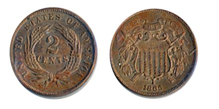 Two Cents. 1865. ICCS Mint State-63. Red. 65% red lustre.