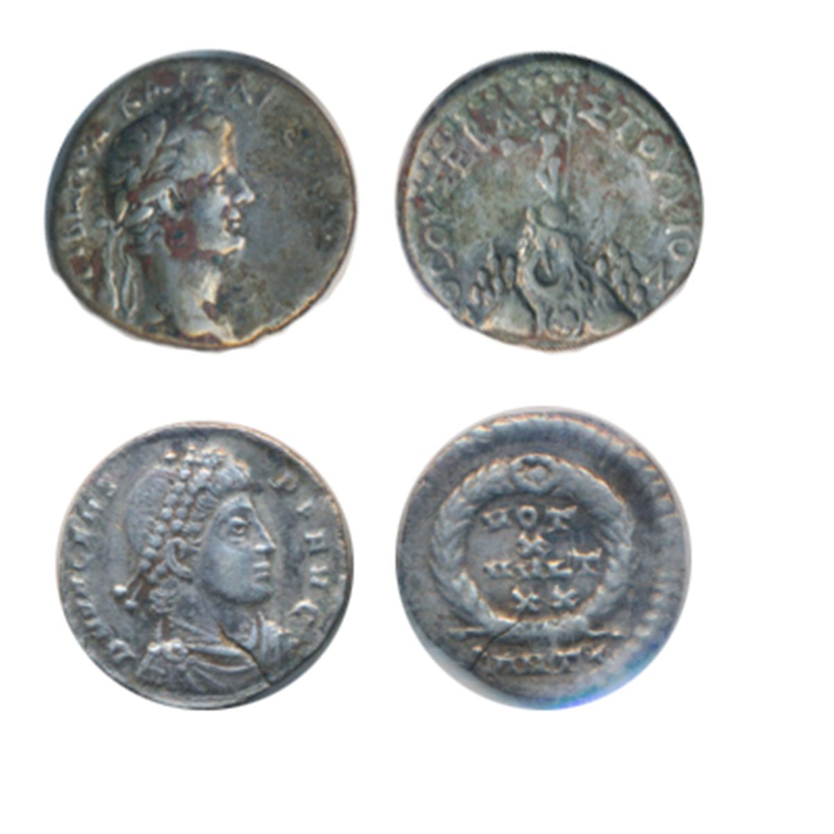 Two silver coins of ancient Rome. Drachm of Caesarea in Cappadocia minted under TIBERIUS (rev: male figure standing on Mt. Argaeus; attractive portrait, About VF), and a siliqua of Antioch minted by VALENS (typical flan crack extending through a third of the flan; VF), Lot of two (2) coins.