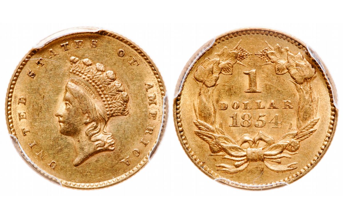 $1 Gold. 1854. 1.672g, .900, 0.04837oz AGW. Type 2. PCGS graded Very Choice About Uncirculated-58. From the Rosedale Collection.