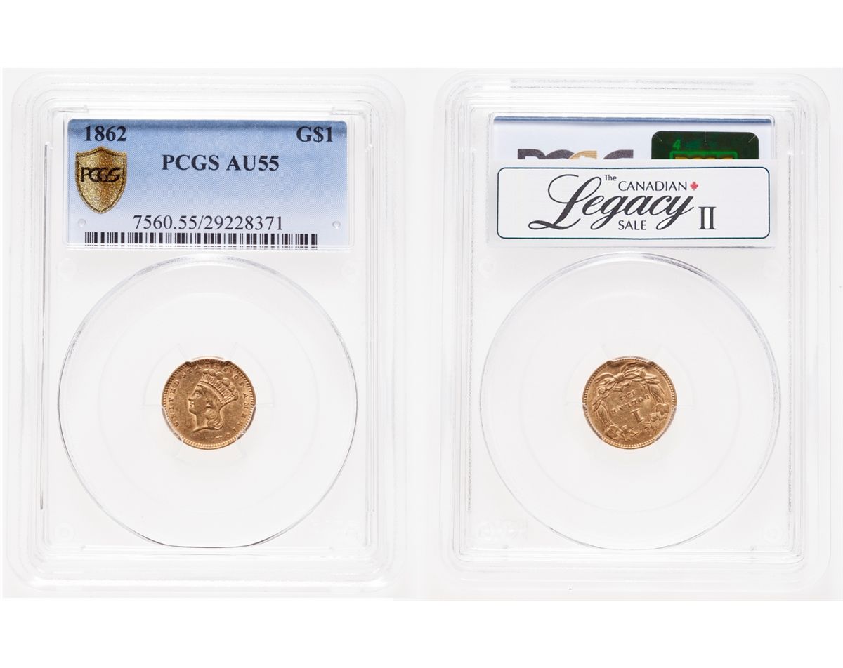 $1 Gold. 1862. 1.672g, .900, 0.04837oz AGW. PCGS graded Choice About Uncirculated-55.
