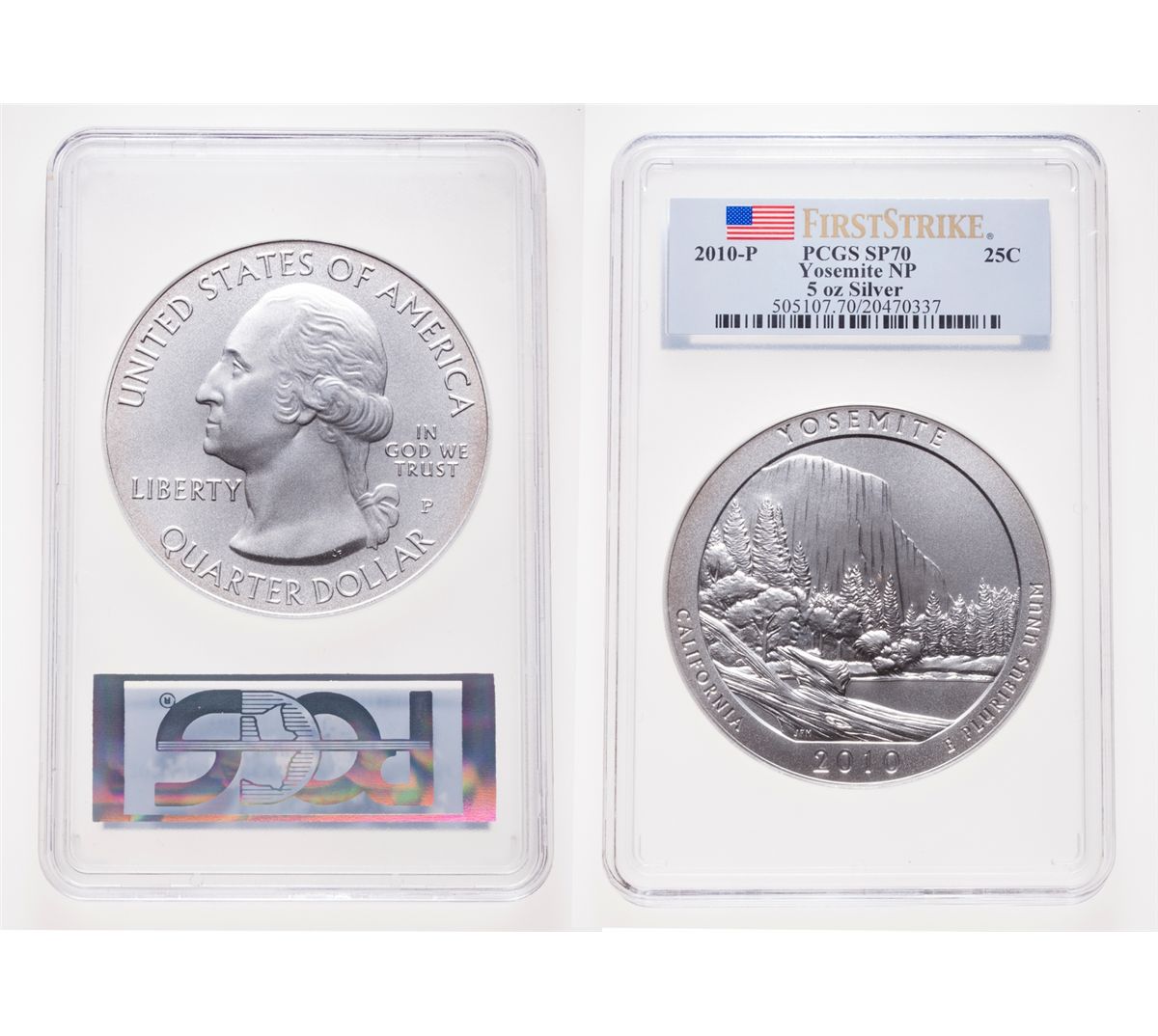 United States. 25 Cents. 2010-P. Silver, 5 oz. Yosemite National Park. PCGS graded Specimen-70. First Strike.