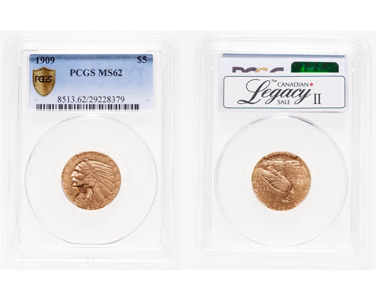 $5 Gold. 1909. 8.359g, .900, 0.24187oz AGW. PCGS graded Uncirculated-62.